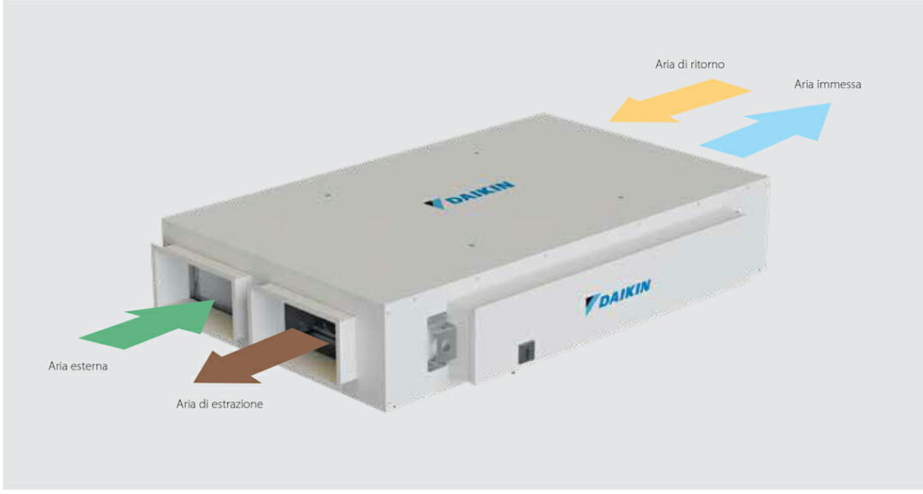 - Trattamento aria: minimizza il carico sull’impianto di climatizzazione riscaldando o raffrescando l’aria in ingresso.